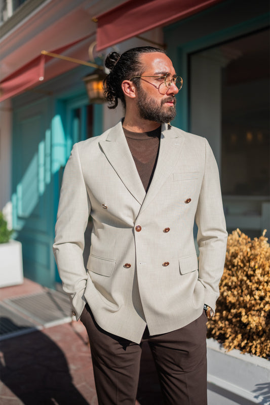 Mazonni Sabbia Men's Beige Pinstripe Blazer Double-Breasted Slim Fit Jacket