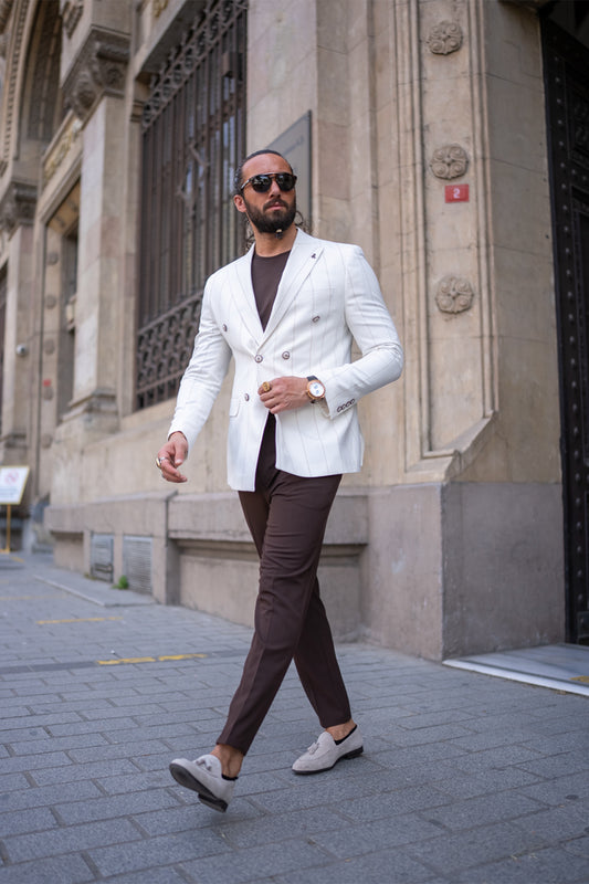Mazonni Bianco Men's White Pinstripe Double-Breasted Slim Fit Blazer