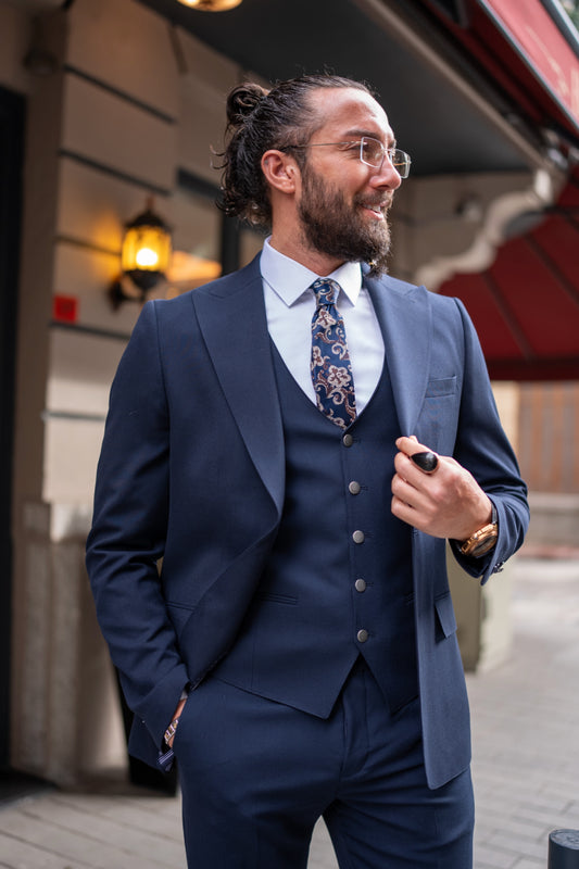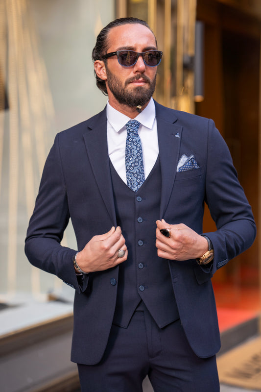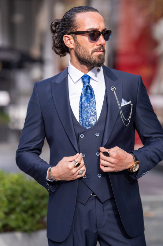 Mazonni Savoy Three-Piece Navy Blue Men's Wedding and Business Suit