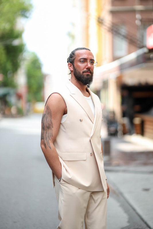 Mazonni SabbiaSleeve Men's Beige Sleeveless Suit Set Modern Summer Style