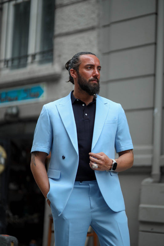 Mazonni Azzurro Men's Light Blue Short Sleeve Suit Set Summer Smart Casual
